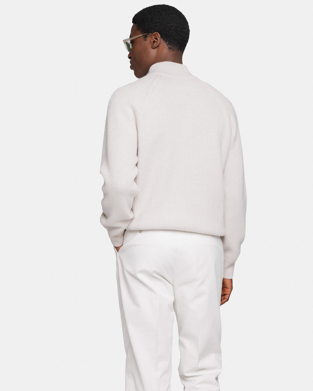 Maglia su misura a 2 fili super-fine titolo 1/15 NM, modello lupetto con zip Riri da 20 cm, manica lunga tinta unita Meringa, realizzata con lussuosa Lana Cardata Super 100's, una pregiata fibra in lana che si distingue per la sua morbidezza e calore. La Lana Cardata, sottoposta al tradizionale processo di cardatura, dona al filato una consistenza voluminosamente soffice e una capacità termica unica, grazie alla presenza di microscopiche bolle d'aria intrappolate tra le fibre.