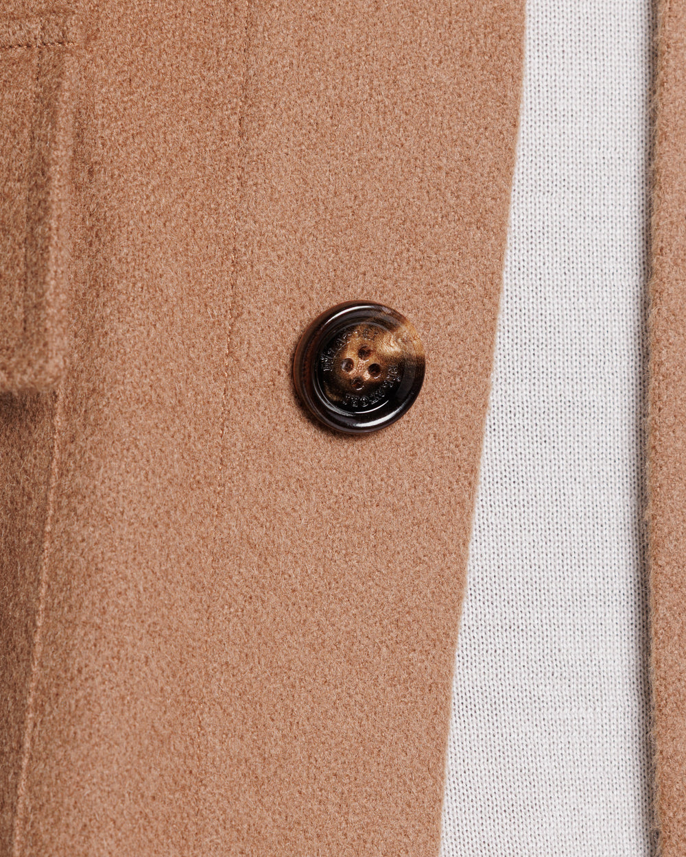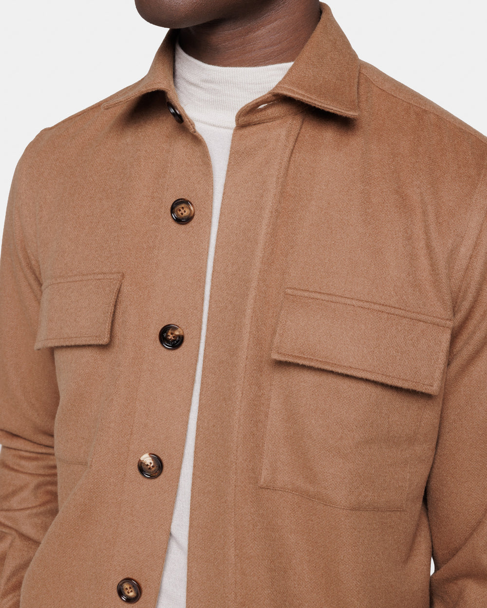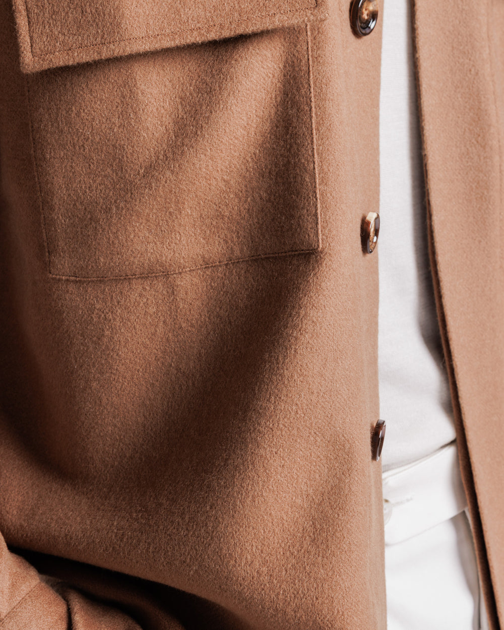 Overshirt su misura tinta unita tabacco con bottoni in autentico Corno di mucca da 32 mm realizzata con tessuto Bactrian 100% Baby Camel Hair Loro Piana made in Italy.