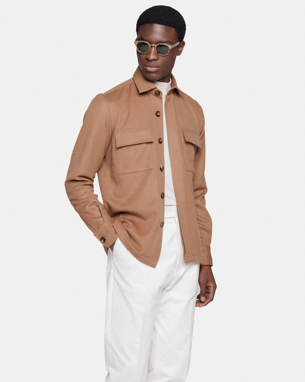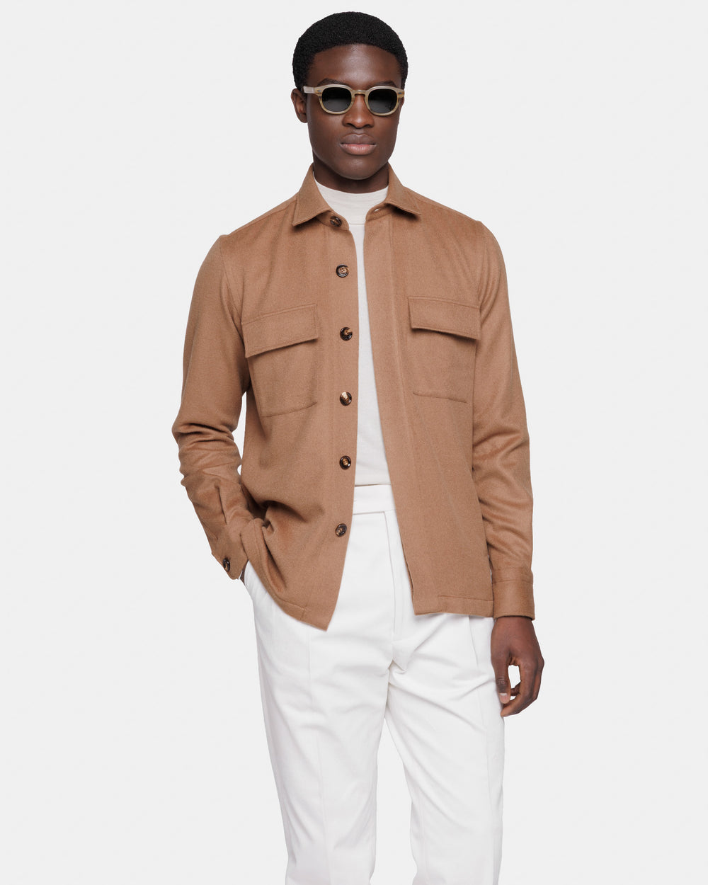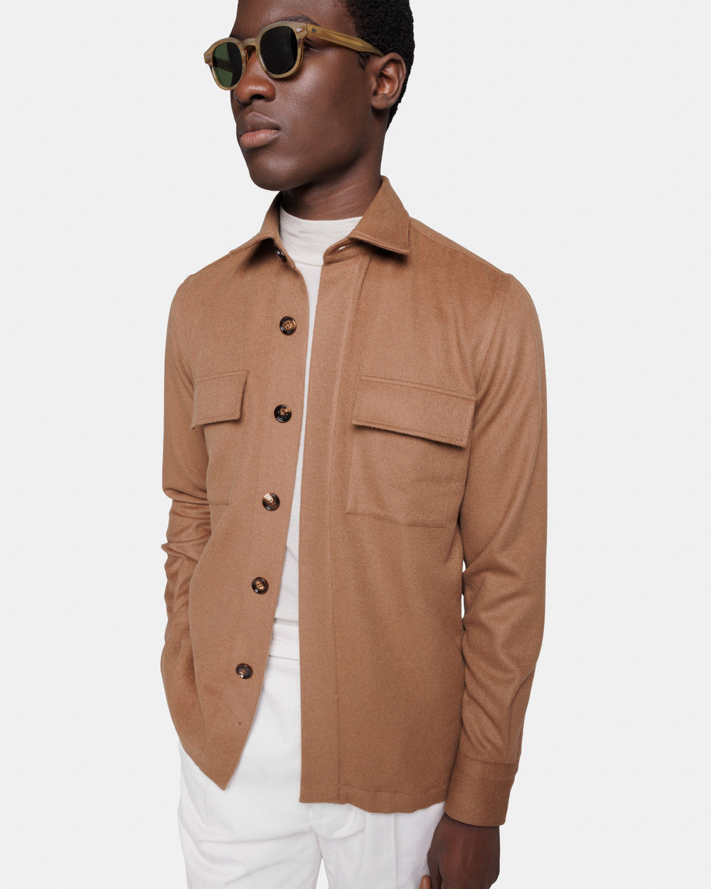 Overshirt su misura tinta unita tabacco con bottoni in autentico Corno di mucca da 32 mm realizzata con tessuto Bactrian 100% Baby Camel Hair Loro Piana made in Italy.