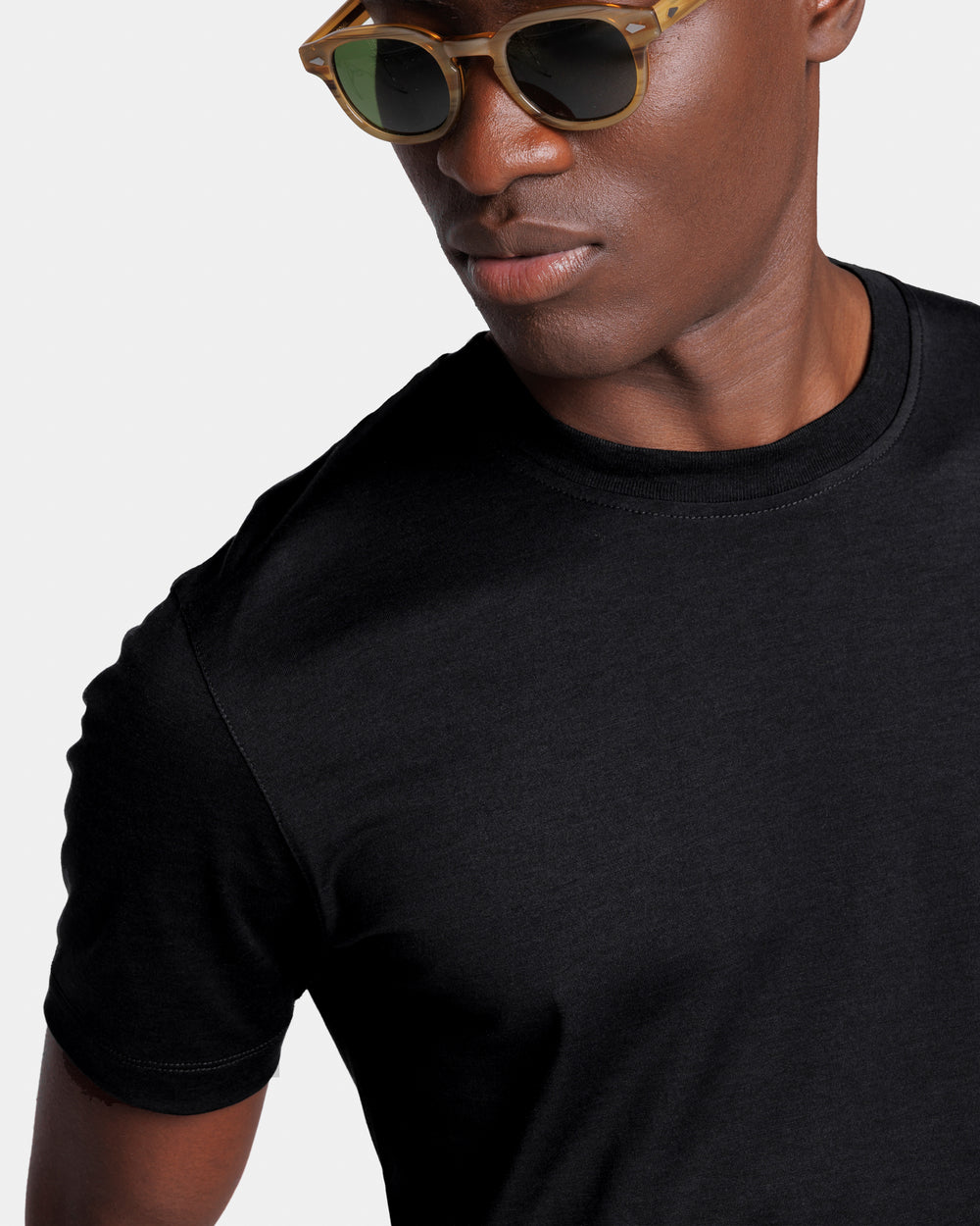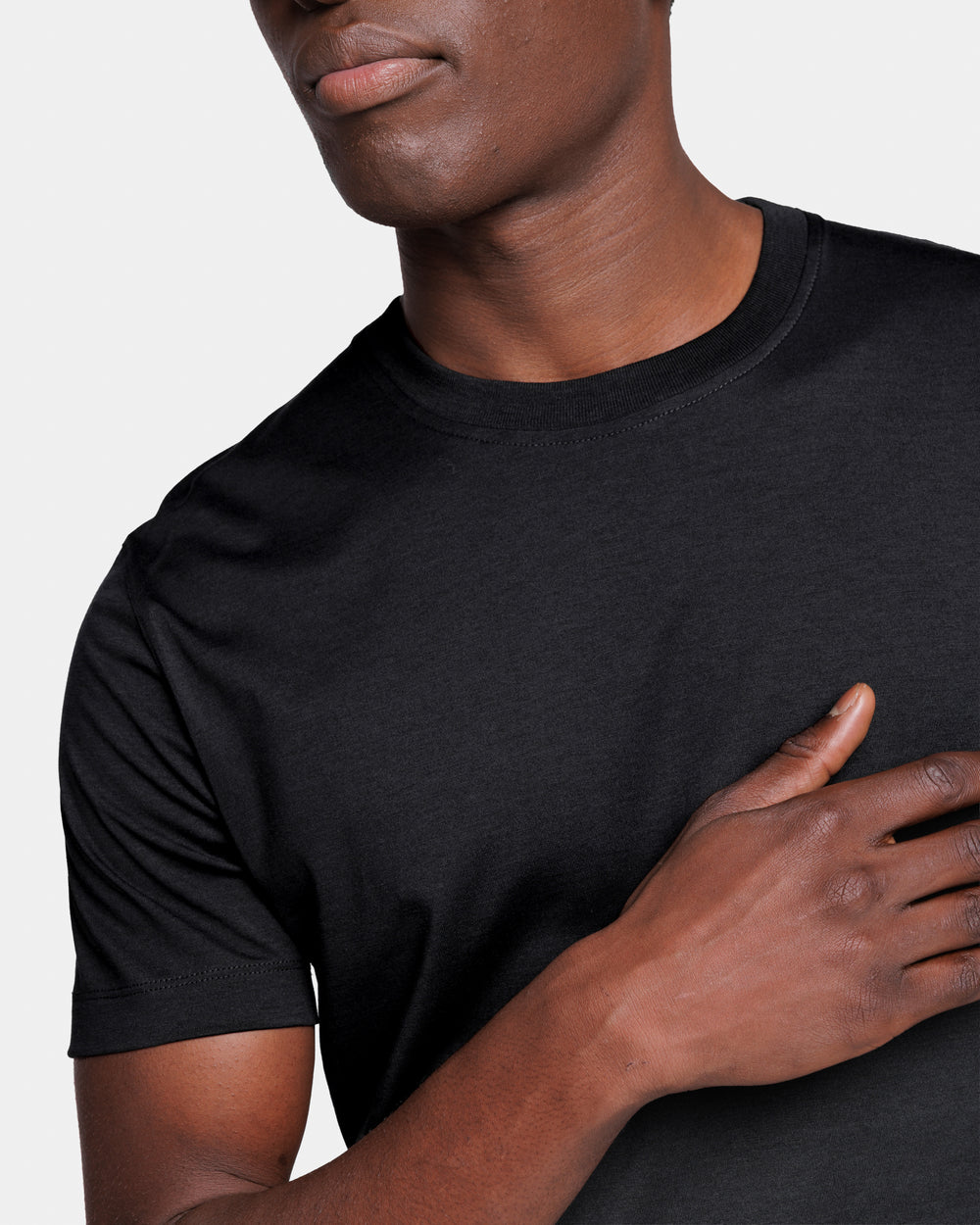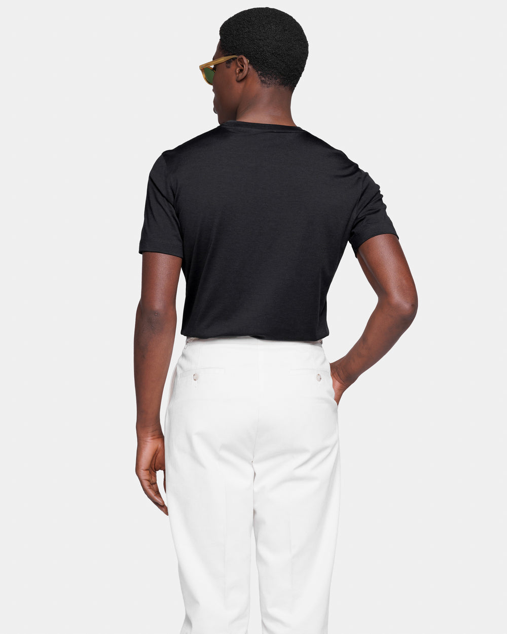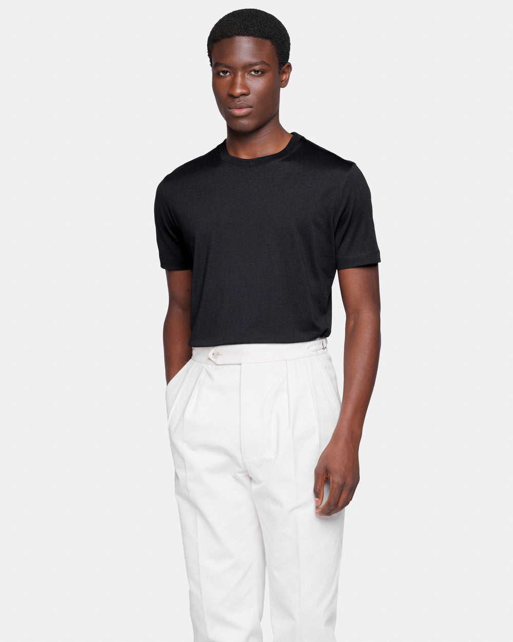 Realizzata nella lussuosa miscela di jersey 2/115.000 di 60% Seta Mulberry e 40% Cotone Organico, lavorato a maglia su telaio finezza 28, colore Nero della tessitura italiana Maglificio Maggia, presenta una mano straordinariamente morbida ed un aspetto semi opaco, combinando la freschezza del cotone con la leggerezza e la luminosità della seta, evocando le atmosfere estive delle isole remote e lo spirito decisamente rilassato delle nostre collezioni.