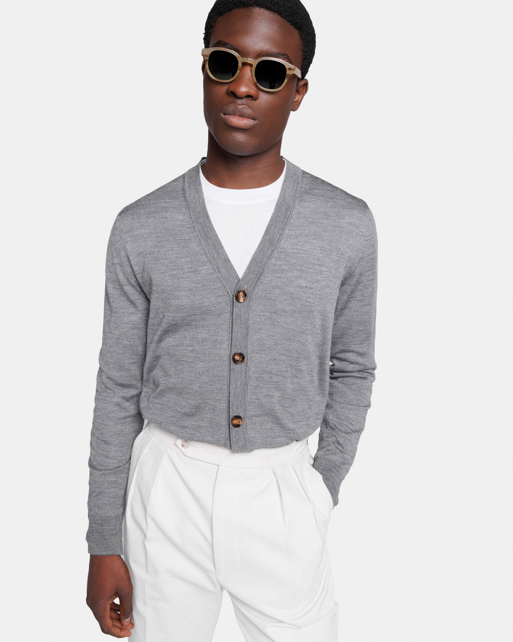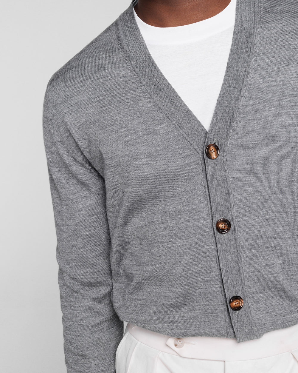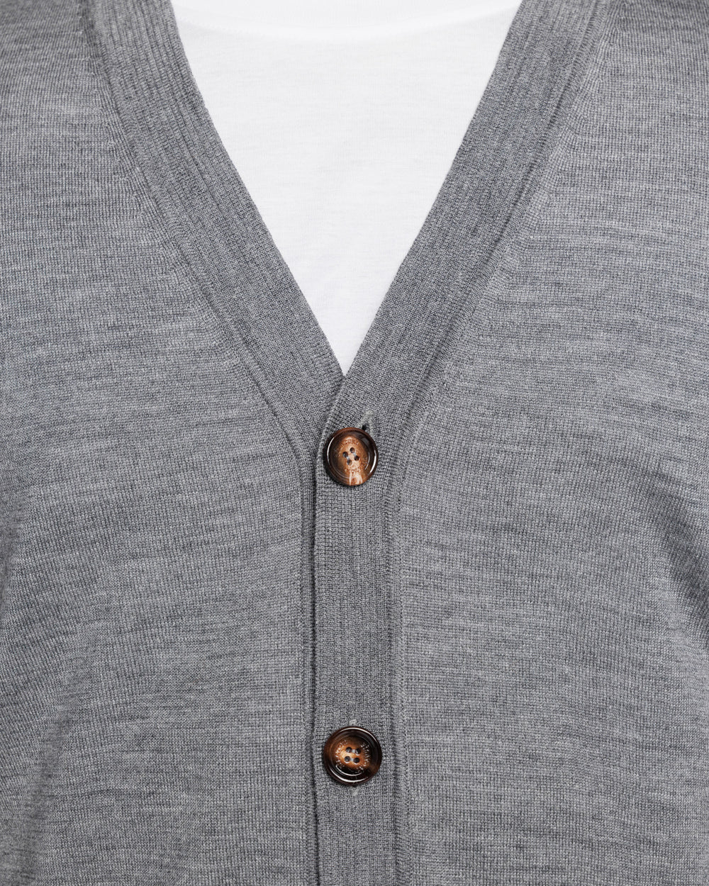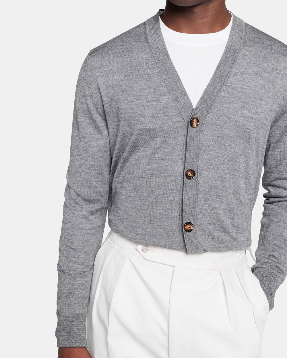 Cardigan su misura in maglia rasata ad 1 filo extra-fine dal titolo 2/48 manica lunga con raffinato scollo a e chiusura frontale a 5 bottoni in autentico Corno di mucca da 32 mm. Proposto in tinta unita grigio carbone, è realizzato in una pregiata, luminosa e morbida combinazione di 70% lana Merino extrafine e 30% seta, una miscela di eccezionale qualità che conferisce al capo un aspetto lineare in cui la mischia preziosa mette in particolare risalto la brillantezza della seta. La maglia naturale offre una sensazione di estrema morbidezza sulla pelle, trasformando un design semplice in un capo di lusso.