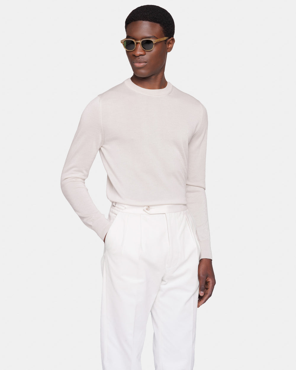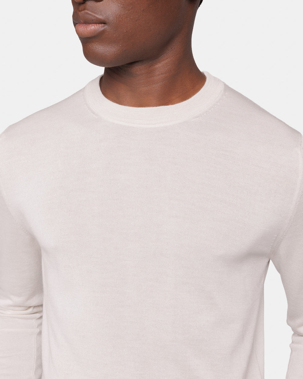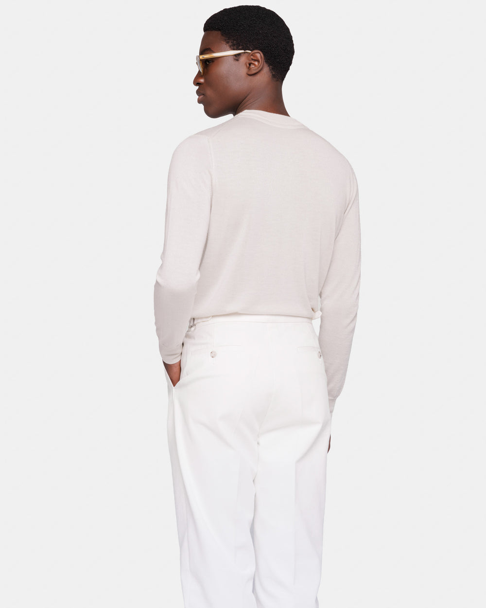 Maglia su misura rasata ad 1 filo ultra-fine dal titolo 2/48 manica lunga tinta unita natural scollo tondo, realizzata in una pregiata, brillante e morbida combinazione di finissimo cashmere e seta Mulberry, la più rara al mondo.