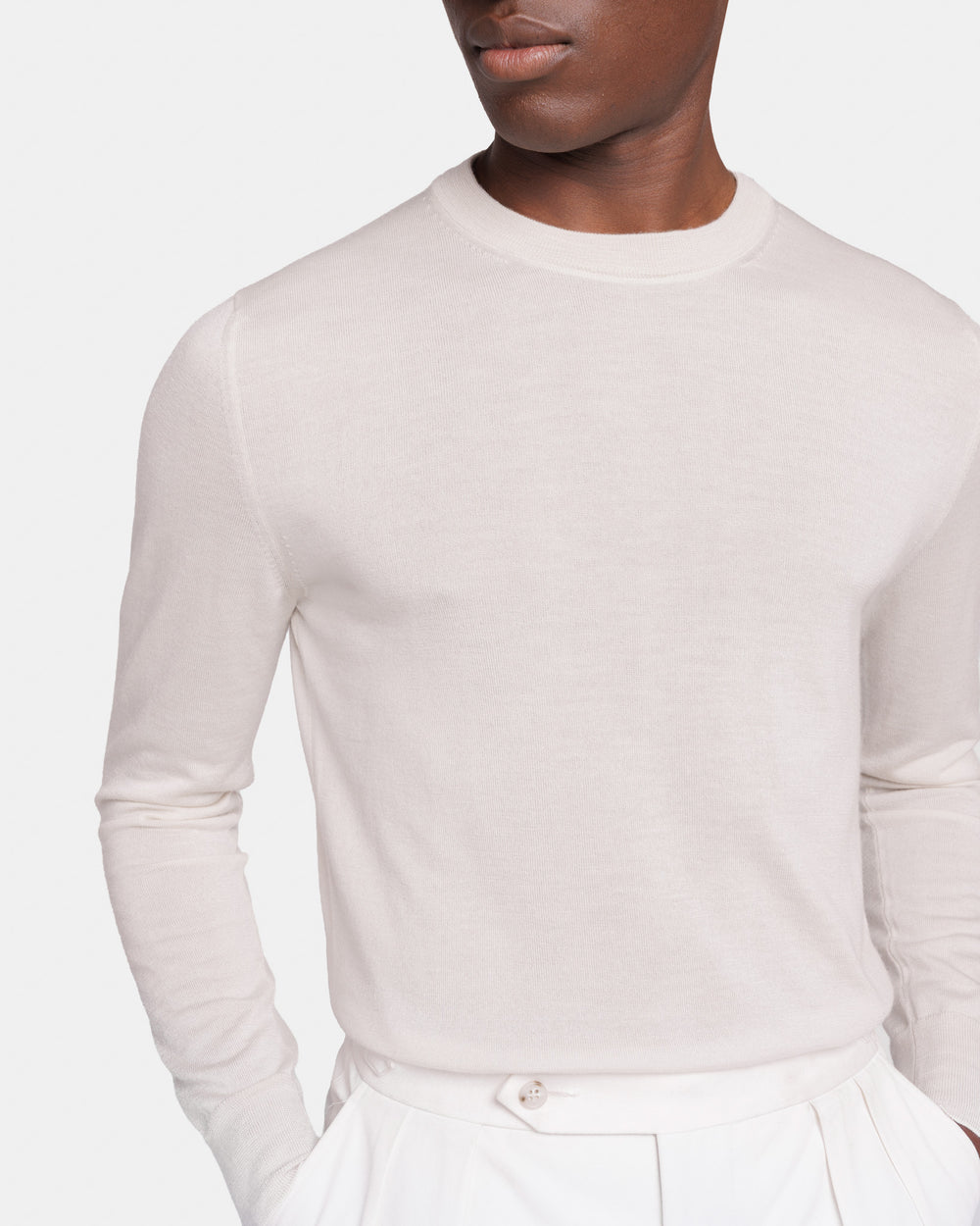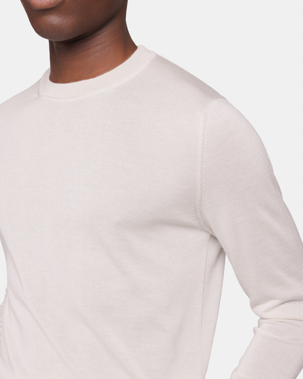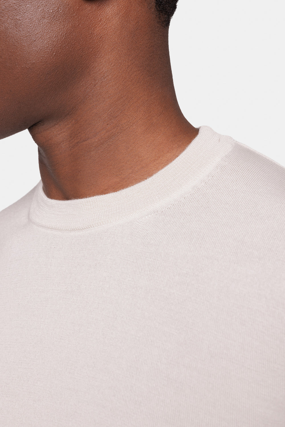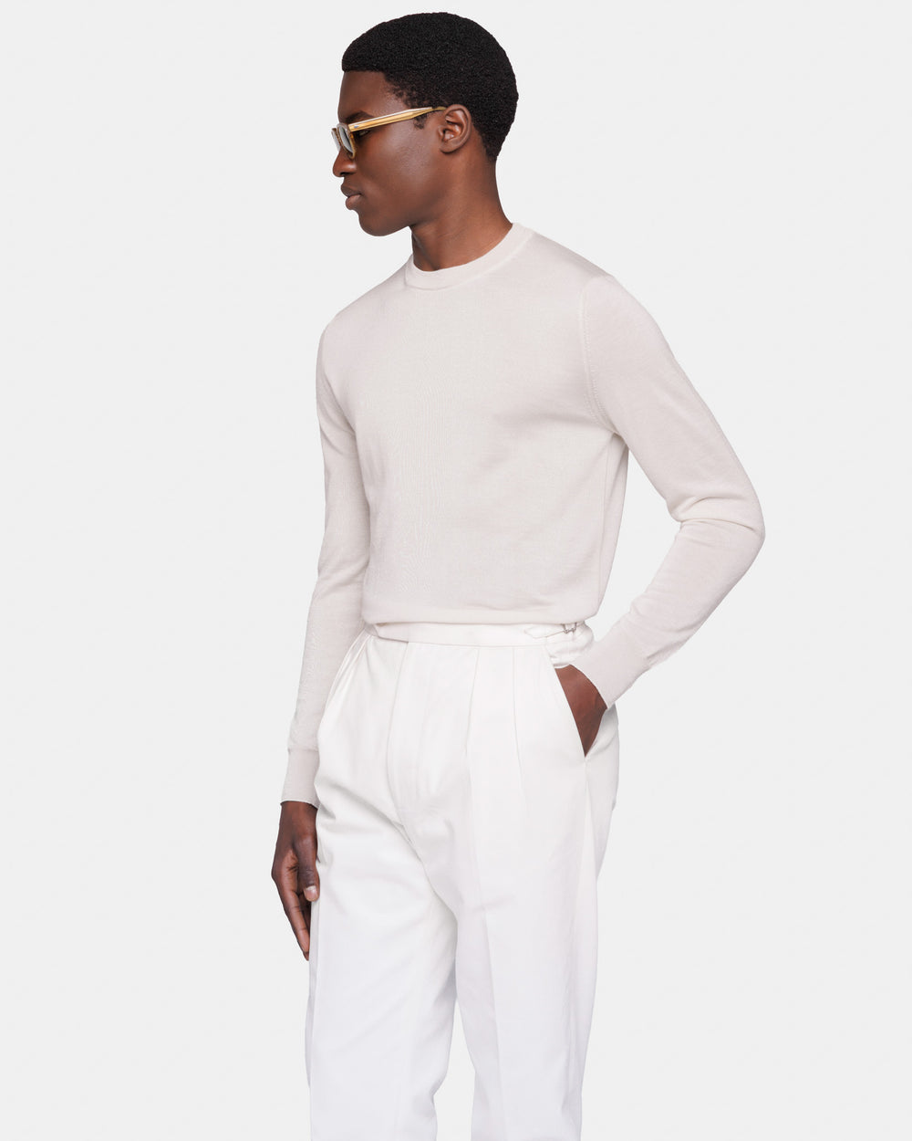 Maglia su misura rasata ad 1 filo ultra-fine dal titolo 2/48 manica lunga tinta unita natural scollo tondo, realizzata in una pregiata, brillante e morbida combinazione di finissimo cashmere e seta Mulberry, la più rara al mondo.