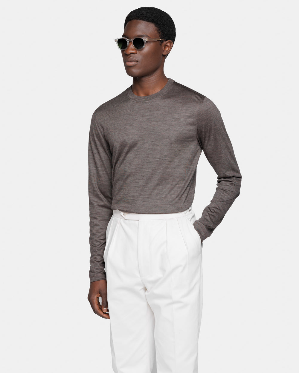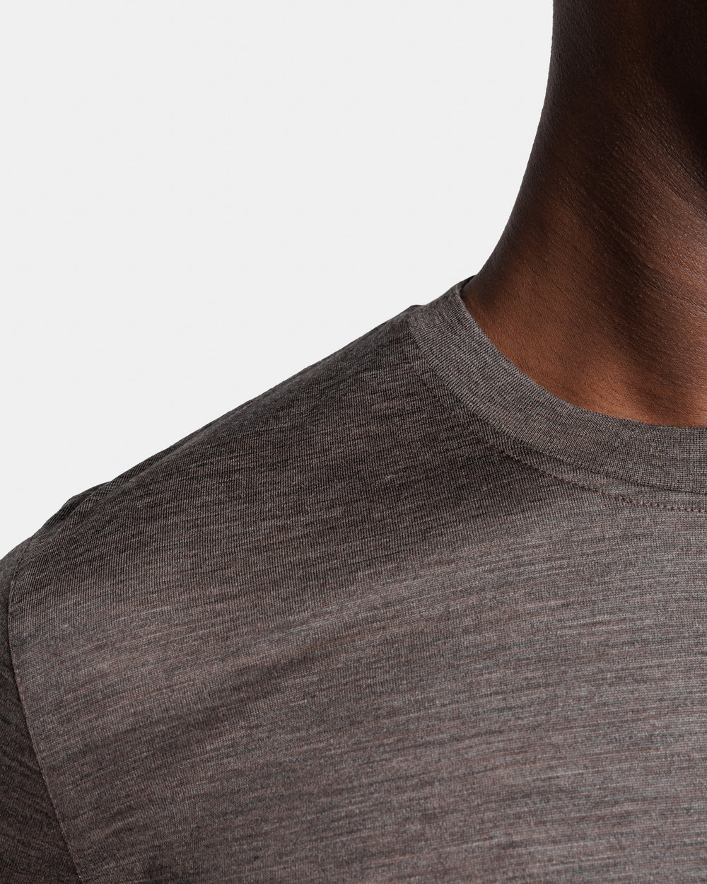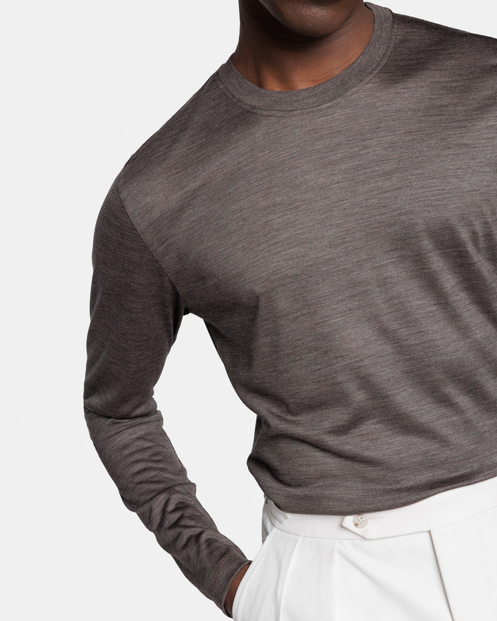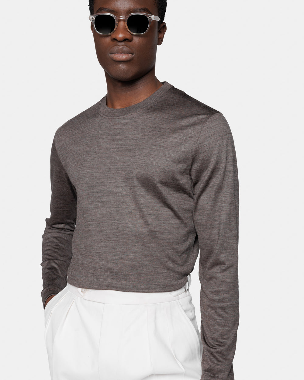 Realizzata nel pregiato filato NM 88/2, composto al 100% da Lana Merino tecnica extrafine 19 micron e trattato con processo TEC per preservarne la struttura, ridurre l'usura e garantire morbidezza e qualità durature, questa t-shirt si distingue per la sua mano soffice e l'aspetto ricercato.