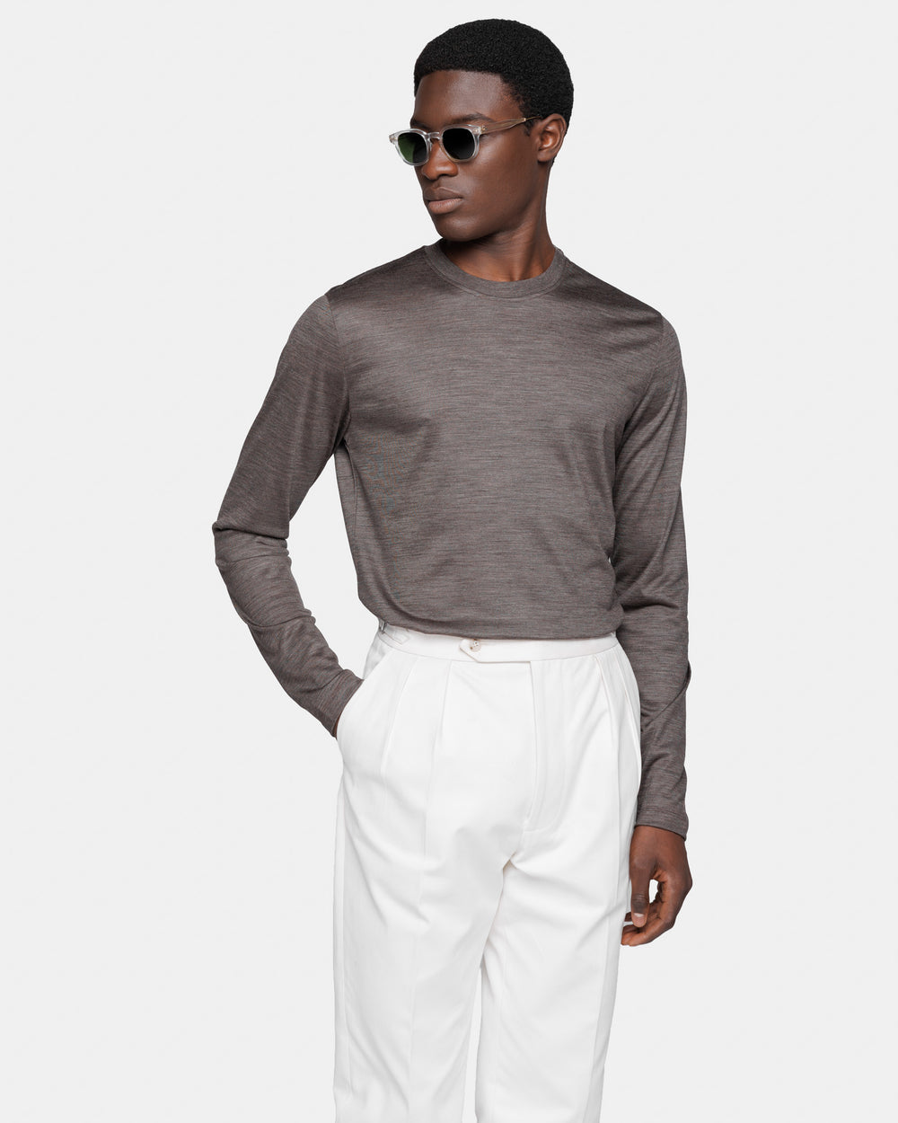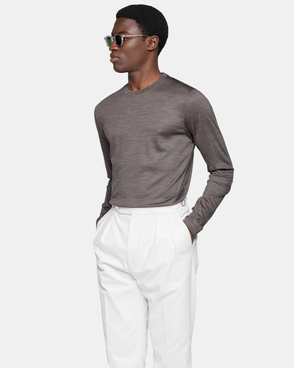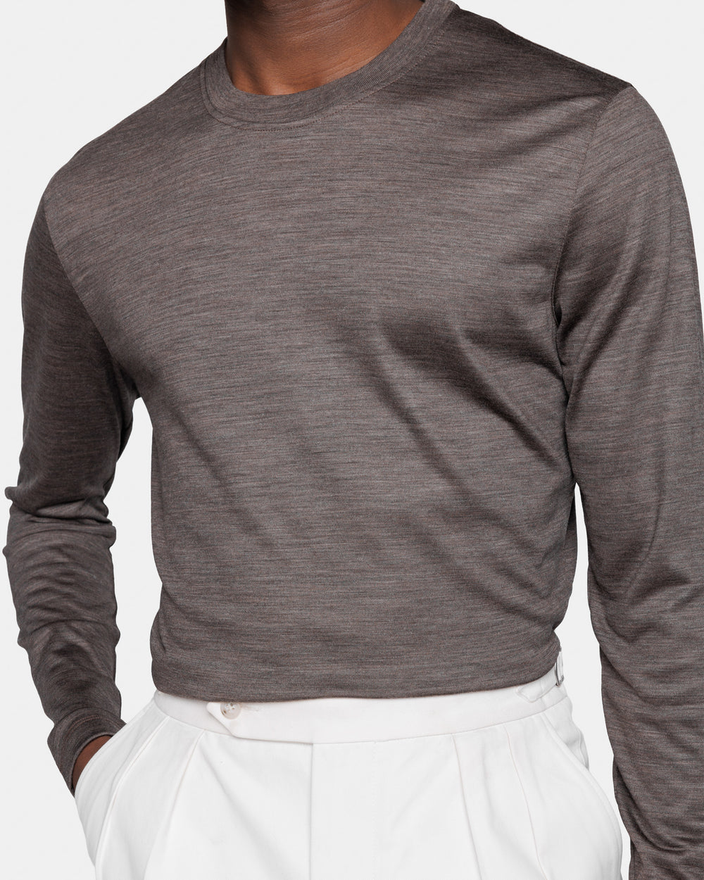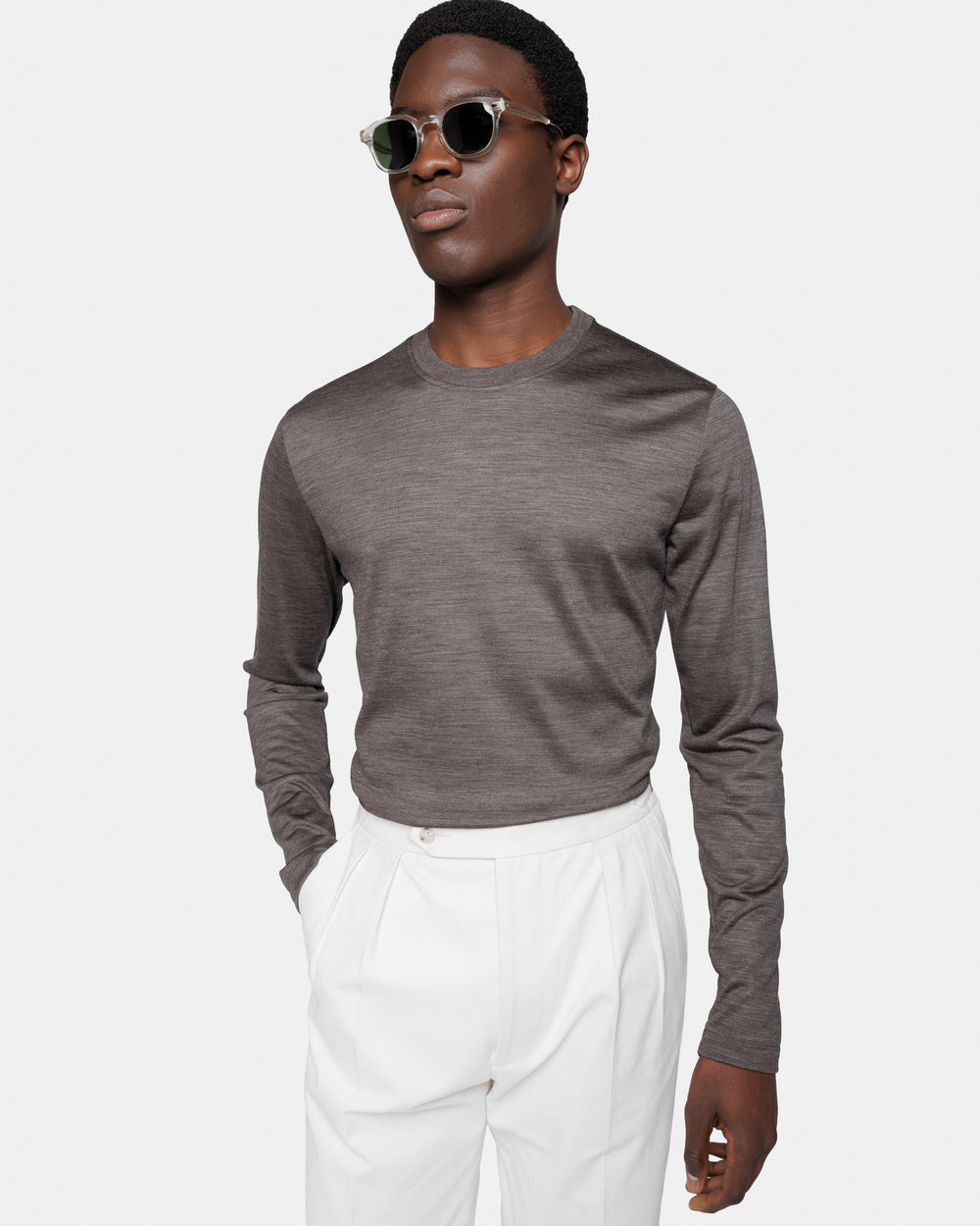 Realizzata nel pregiato filato NM 88/2, composto al 100% da Lana Merino tecnica extrafine 19 micron e trattato con processo TEC per preservarne la struttura, ridurre l'usura e garantire morbidezza e qualità durature, questa t-shirt si distingue per la sua mano soffice e l'aspetto ricercato.