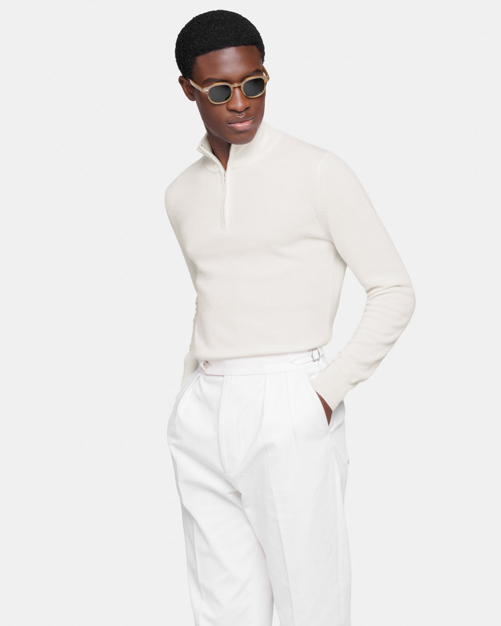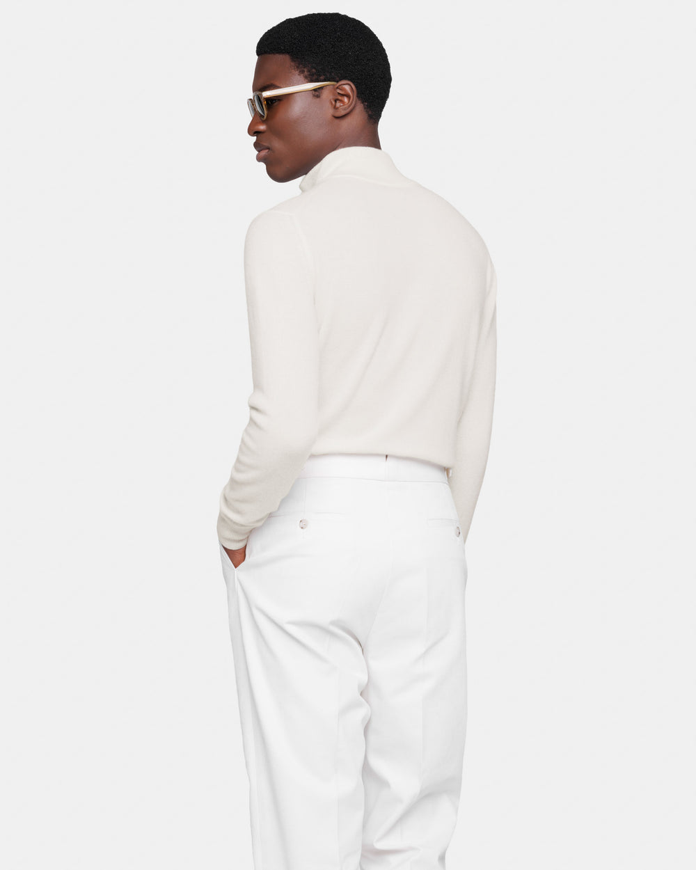 Tailor-made 1-ply half zip knit with a 20 cm Riri zipper, 2/27 yarn gauge, long sleeves, in off-white color, made from a precious, refined, and ultra-fine pure cashmere Crown Reserve fiber coming from the most remote regions of Mongolia, then reaching the mills of Quarona Sesia in Piedmont, where it is skillfully processed by the world’s most prestigious spinning mill to give life to a 2/27 carded yarn.