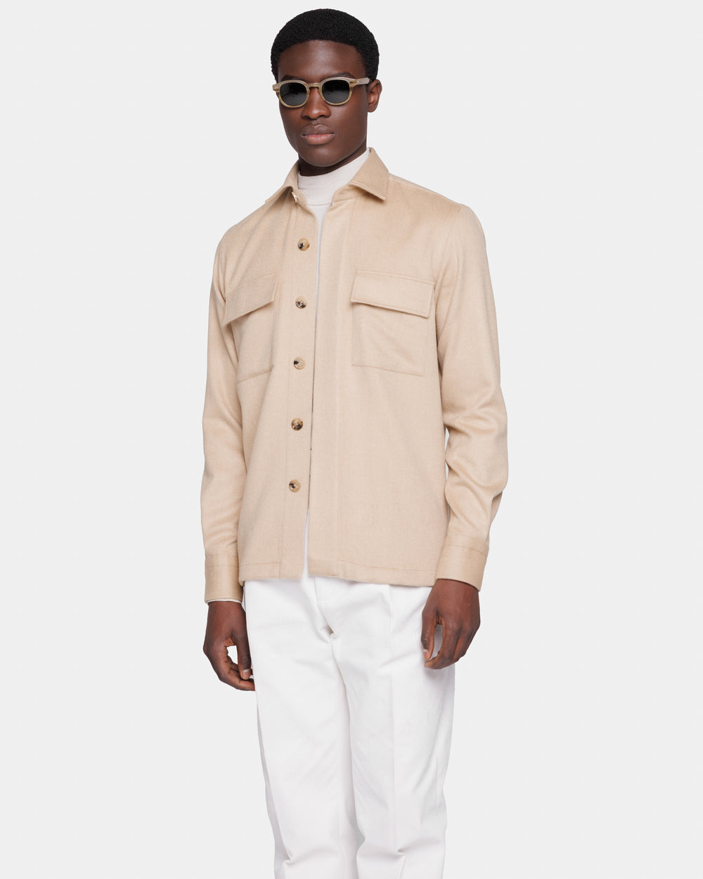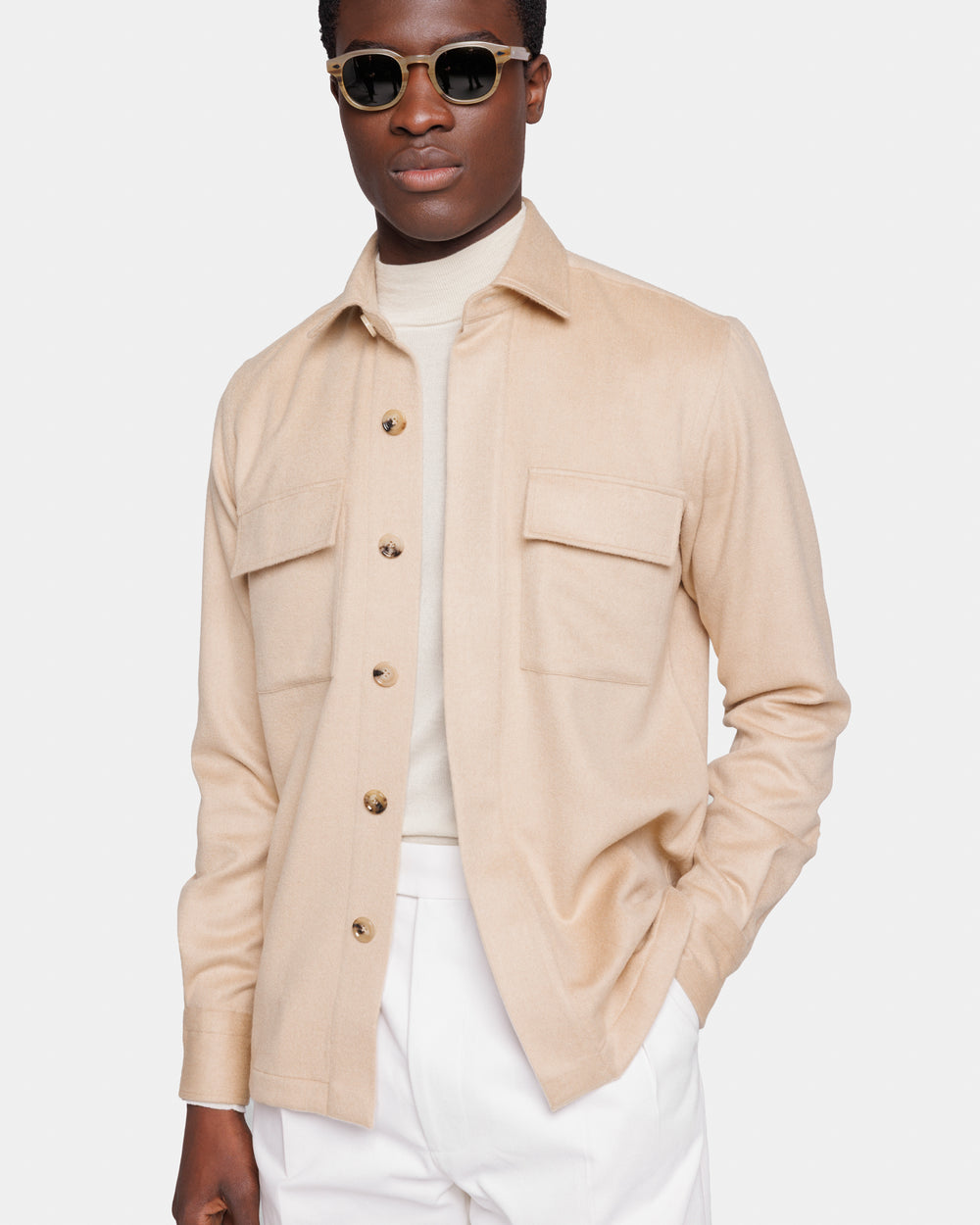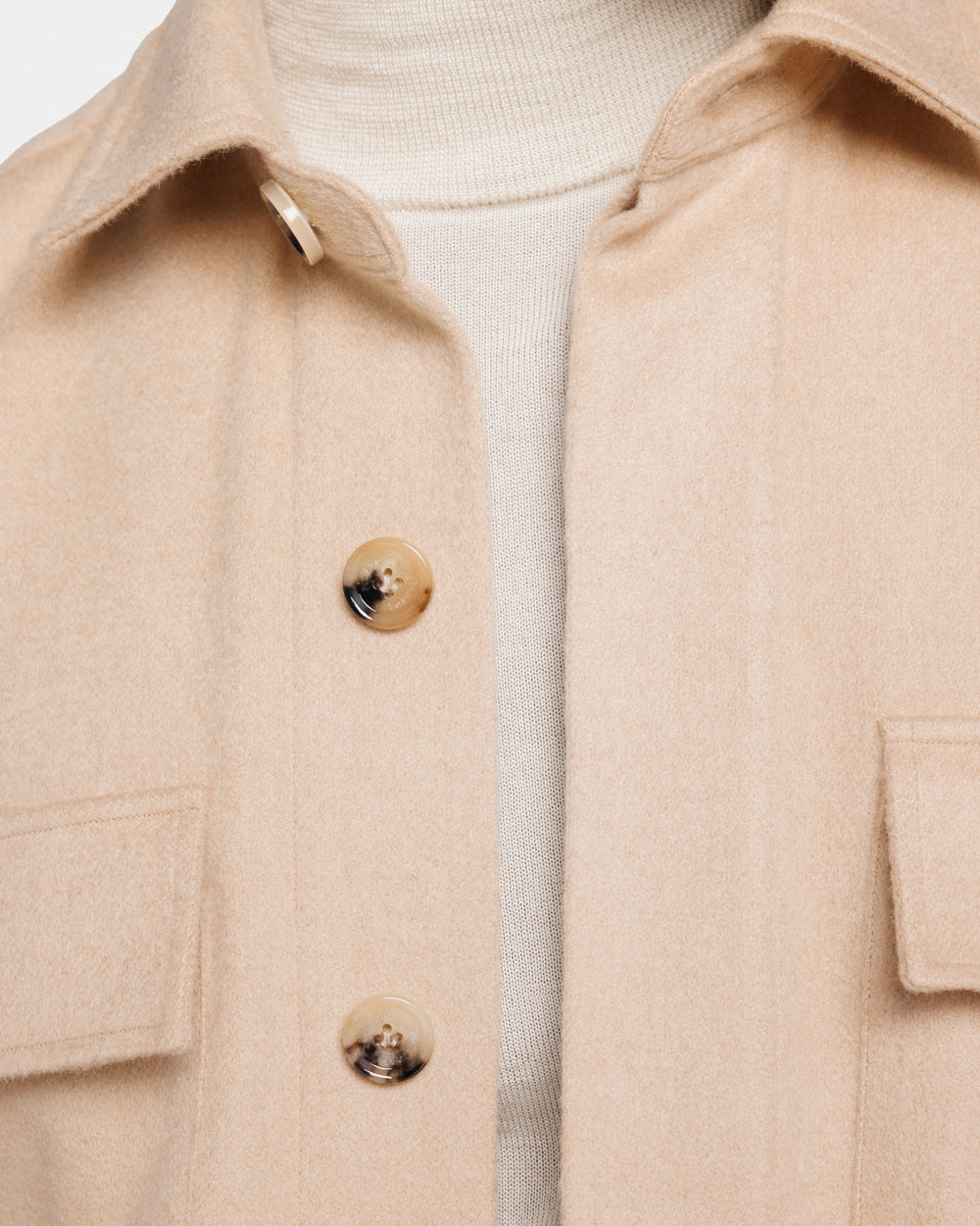 Tailor-made sand solid-color Overshirt with authentic 32 mm Buffalo Horn buttons, crafted from Loro Piana Bactrian 100% Baby Camel Hair fabric, made in Italy.