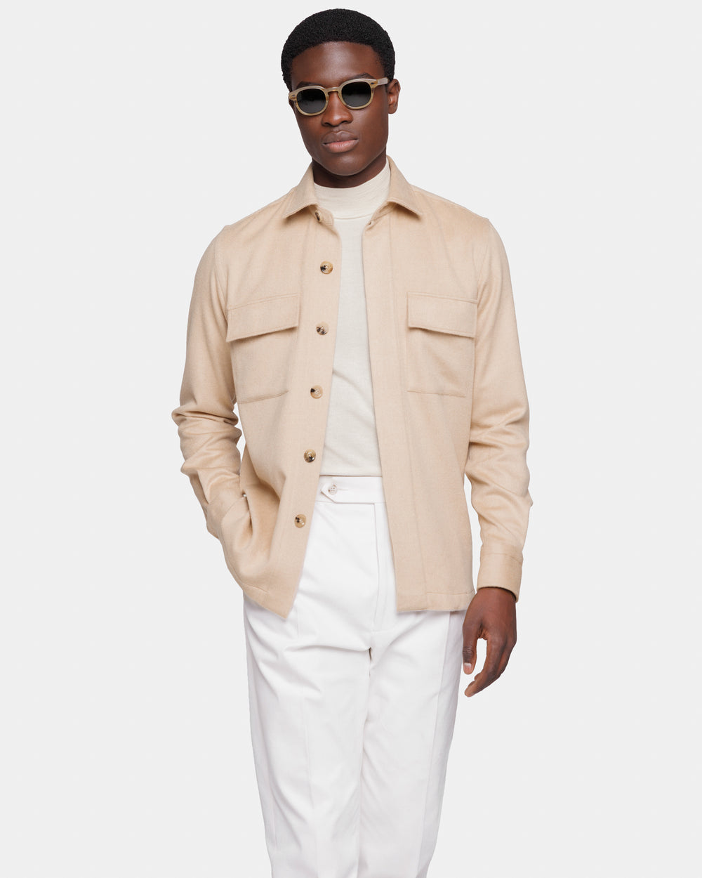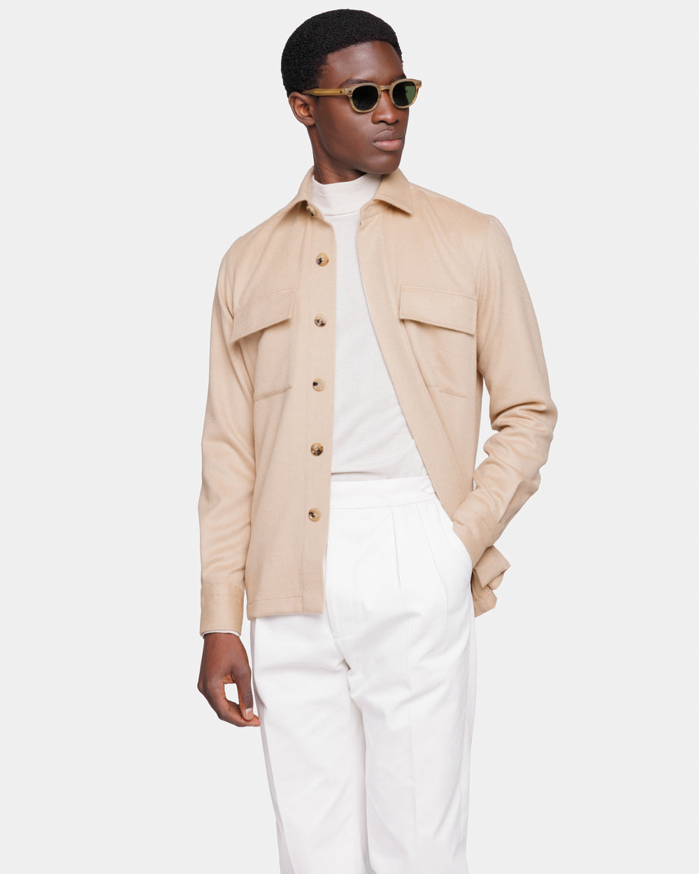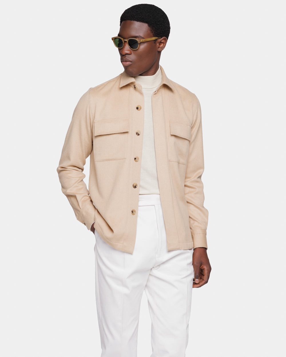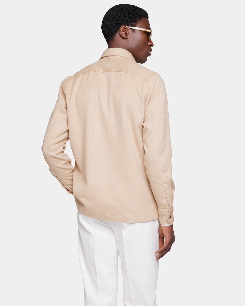 Tailor-made sand solid-color Overshirt with authentic 32 mm Buffalo Horn buttons, crafted from Loro Piana Bactrian 100% Baby Camel Hair fabric, made in Italy.